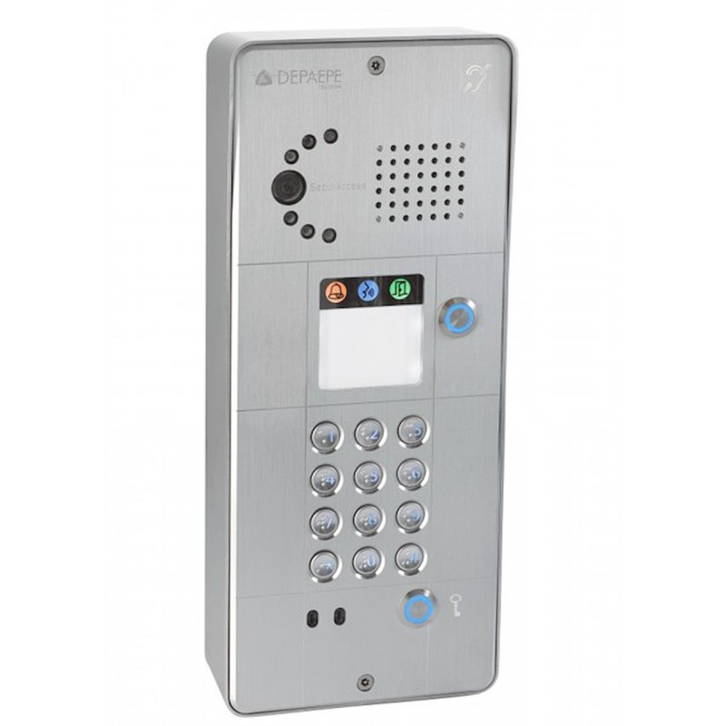 The SecurAccess PMR 1-Button Keypad is an intercom/telephone door entry system. It complies with disability law. Its keypad allows dialing to make calls, or serves as an access code panel. This product is manufactured in France and available in several colors.